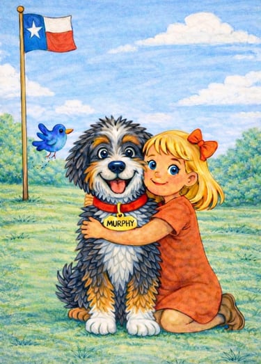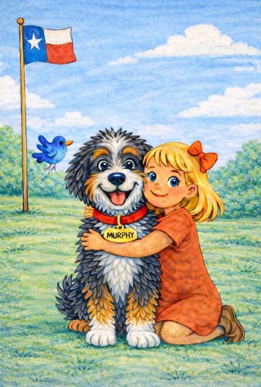 Murphy Doo, is a nutty, fun-loving pup with a big heart, inspired by my own tricolored Bernedoodle. From chomping at water to greeting everyone he meets, Murphy brings laughter, love and joy wherever he goes. The “Doo” in his name is a playful nod to all the Doodle breeds, but his character represents every beloved fur baby who becomes part of our families.